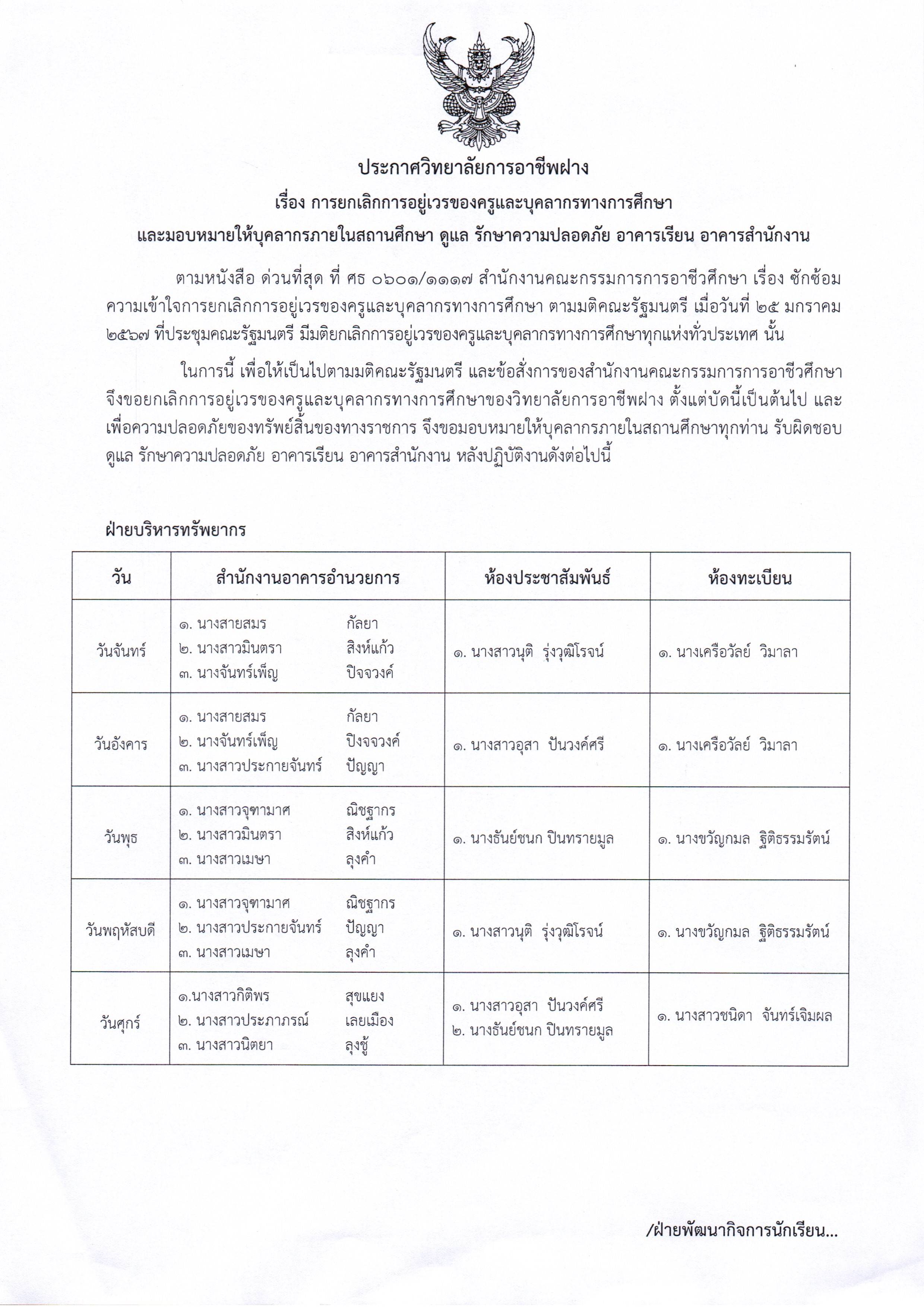 ประกาศวิทยาลัยการอาชีพฝาง เรื่อง การยกเลิกการอยู่เวรของครูและบุคลากรทางการศึกษาและมอบหมายให้บุคลากรภายในสถานศึกษา ดูแล รักษาความปลอดภัยอาคารเรียน อาคารสำนักงาน 14 กุมภาพันธ์ 202414 กุมภาพันธ์ 2024จุฑามาศ ณิชฐากรข่าวสารสำหรับครูและบุคลากร