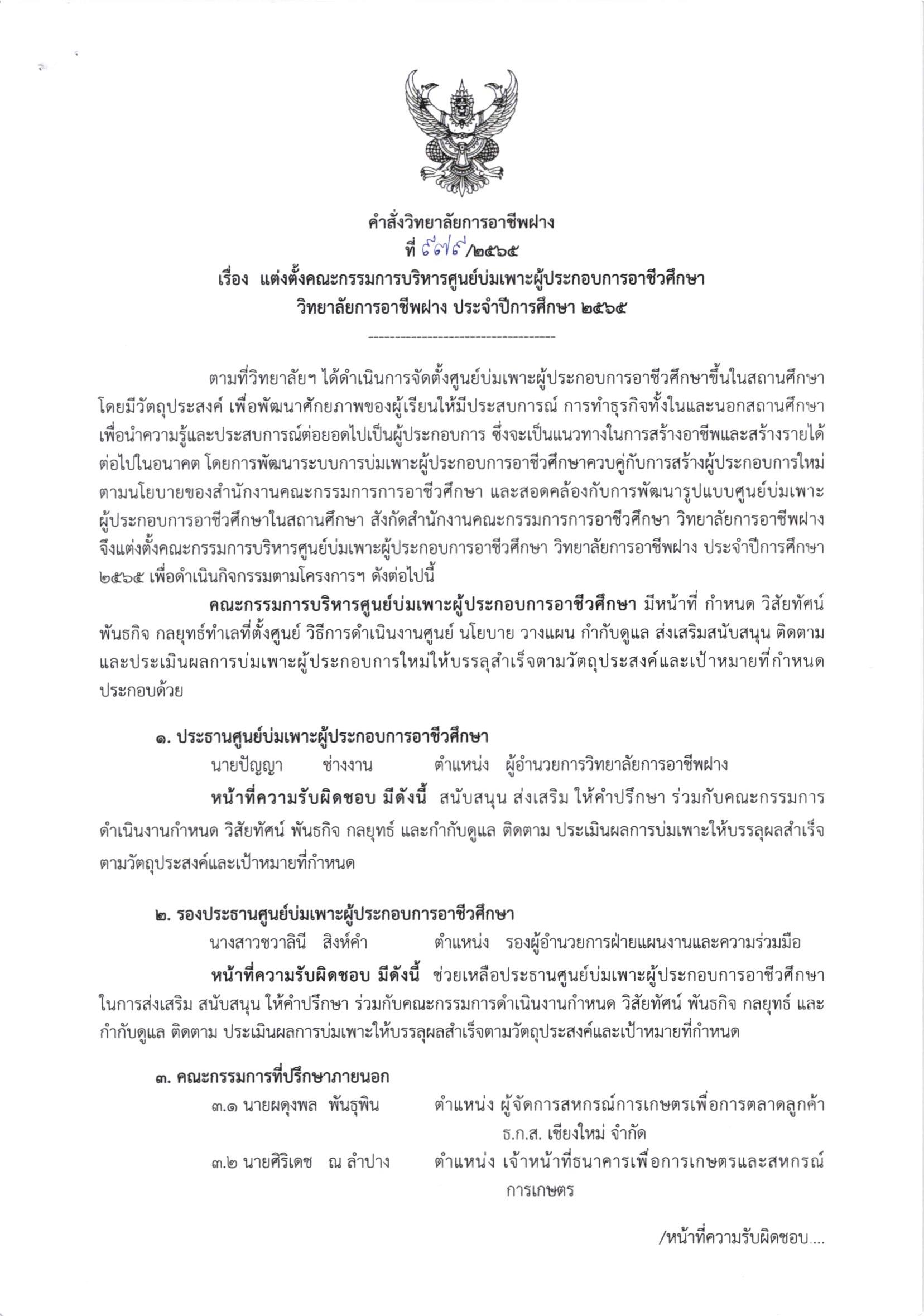 คำสั่ง แต่งตั้งคณะกรรมการบริหารศูนย์บ่มเพาะผู้ประกอบการอาชีวศึกษา วิทยาลัยการอาชีพฝาง ประจำปีการศึกษา 2565 27 ธันวาคม 202227 ธันวาคม 2022จุฑามาศ ณิชฐากรข่าวสารสำหรับครูและบุคลากร