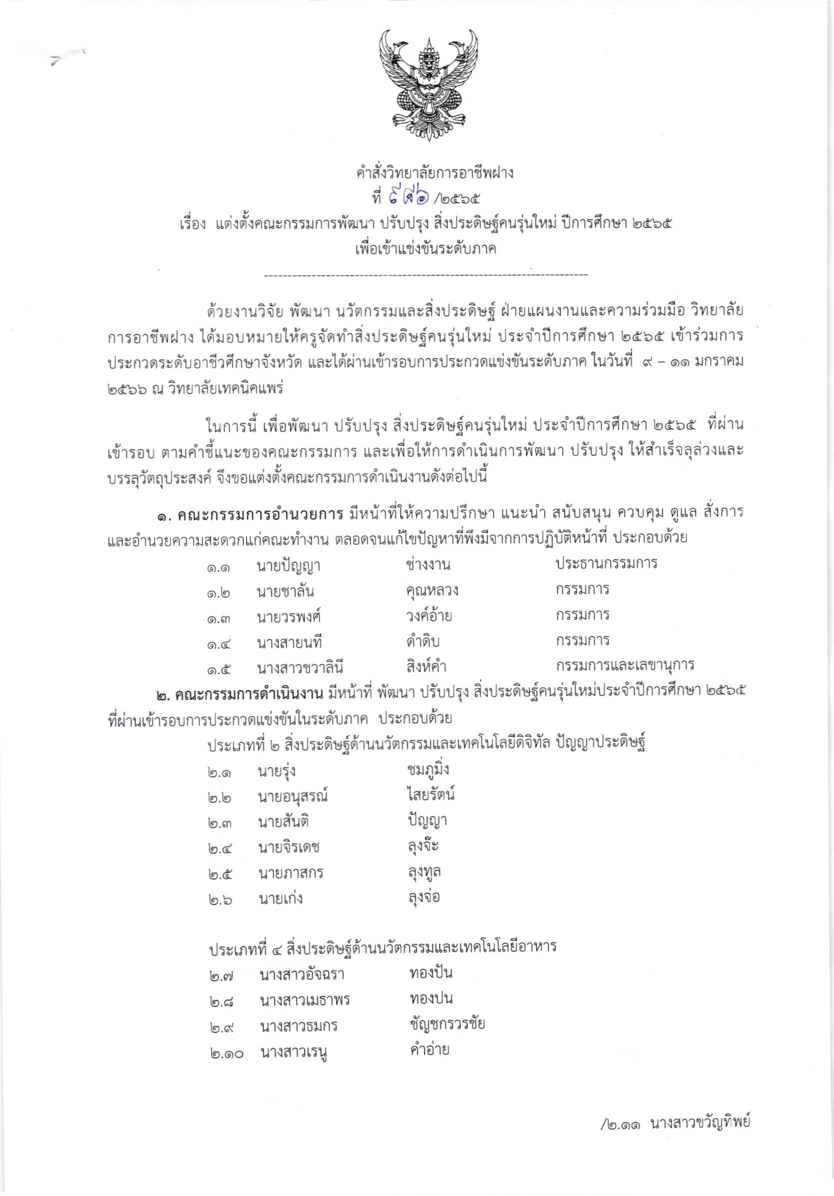 คำสั่ง แต่งตั้งคณะกรรมการพัฒนา ปรับปรุง สิ่งประดิษฐ์คนรุ่นใหม่ ปีการศึกษา 2565 เพื่อเข้าแข่งขันระดับภาค 28 ธันวาคม 202228 ธันวาคม 2022จุฑามาศ ณิชฐากรข่าวสารสำหรับครูและบุคลากร