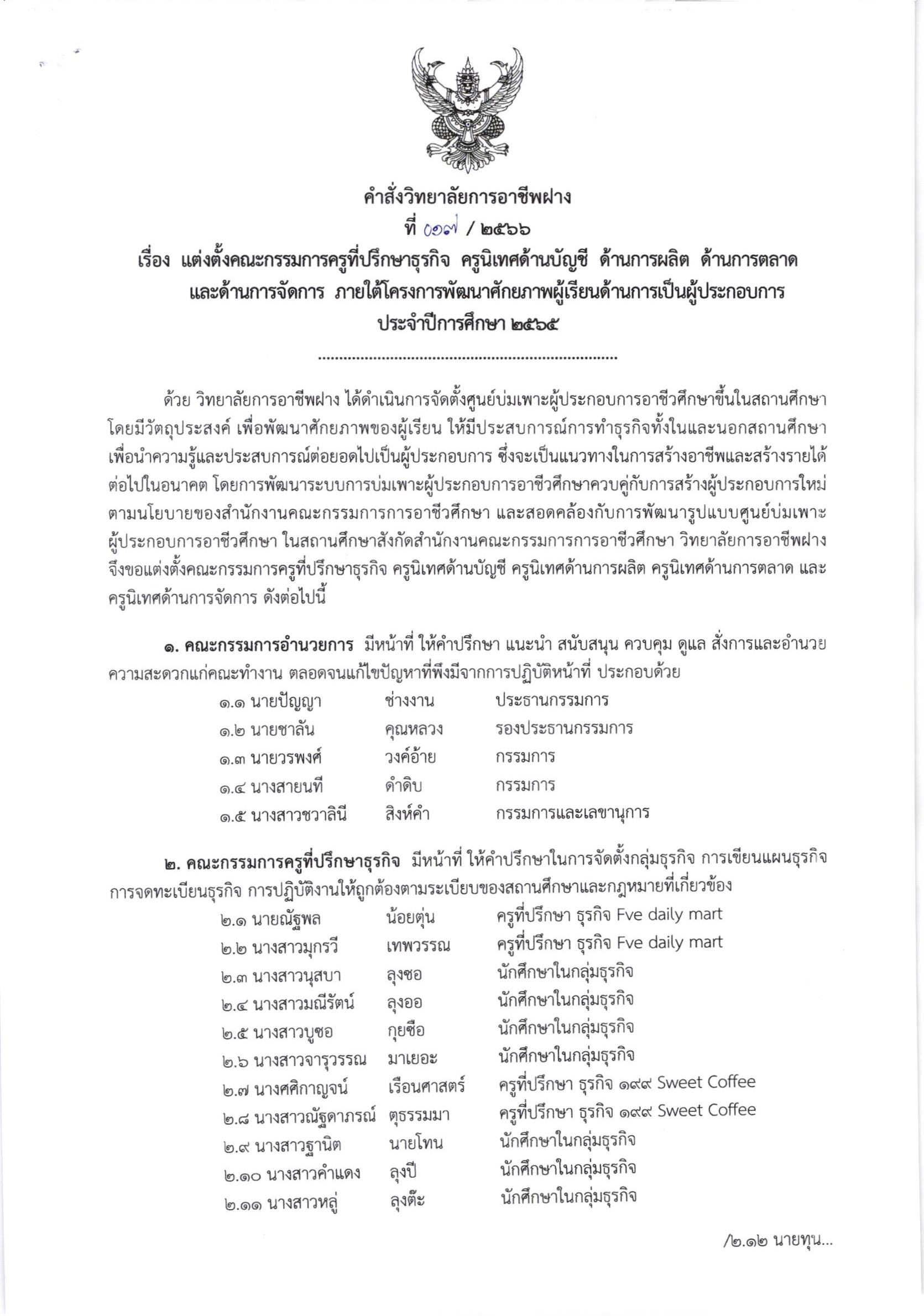 คำสั่ง แต่งตั้งคณะกรรมการครูที่ปรึกษาธุรกิจ ครูนิเทศด้านบัญชี ด้านการผลิต ด้านการตลาด และด้านการจัดการ ภายใต้โครงการพัฒนาศักยภาพผู้เรียนด้านการเป็นผู้ประกอบการ ประจำปีการศึกษา 2565 9 มกราคม 20239 มกราคม 2023จุฑามาศ ณิชฐากรข่าวสารสำหรับครูและบุคลากร