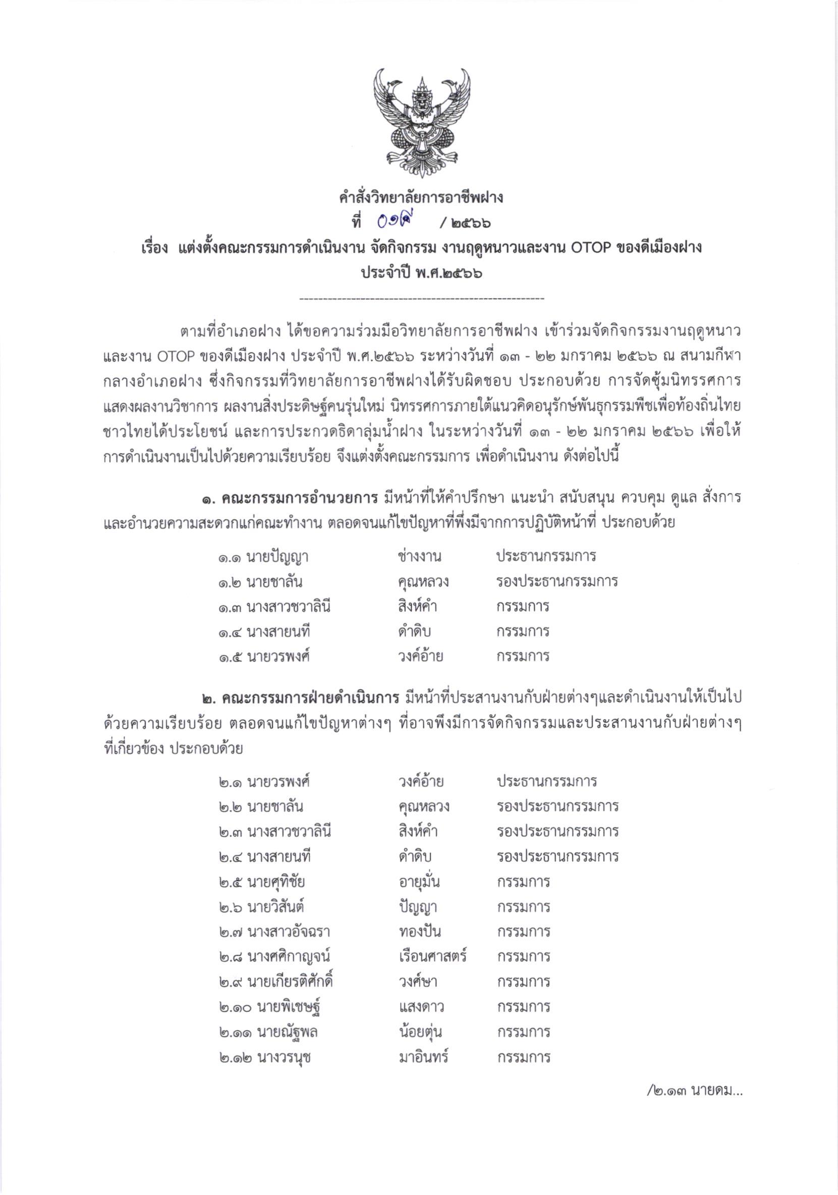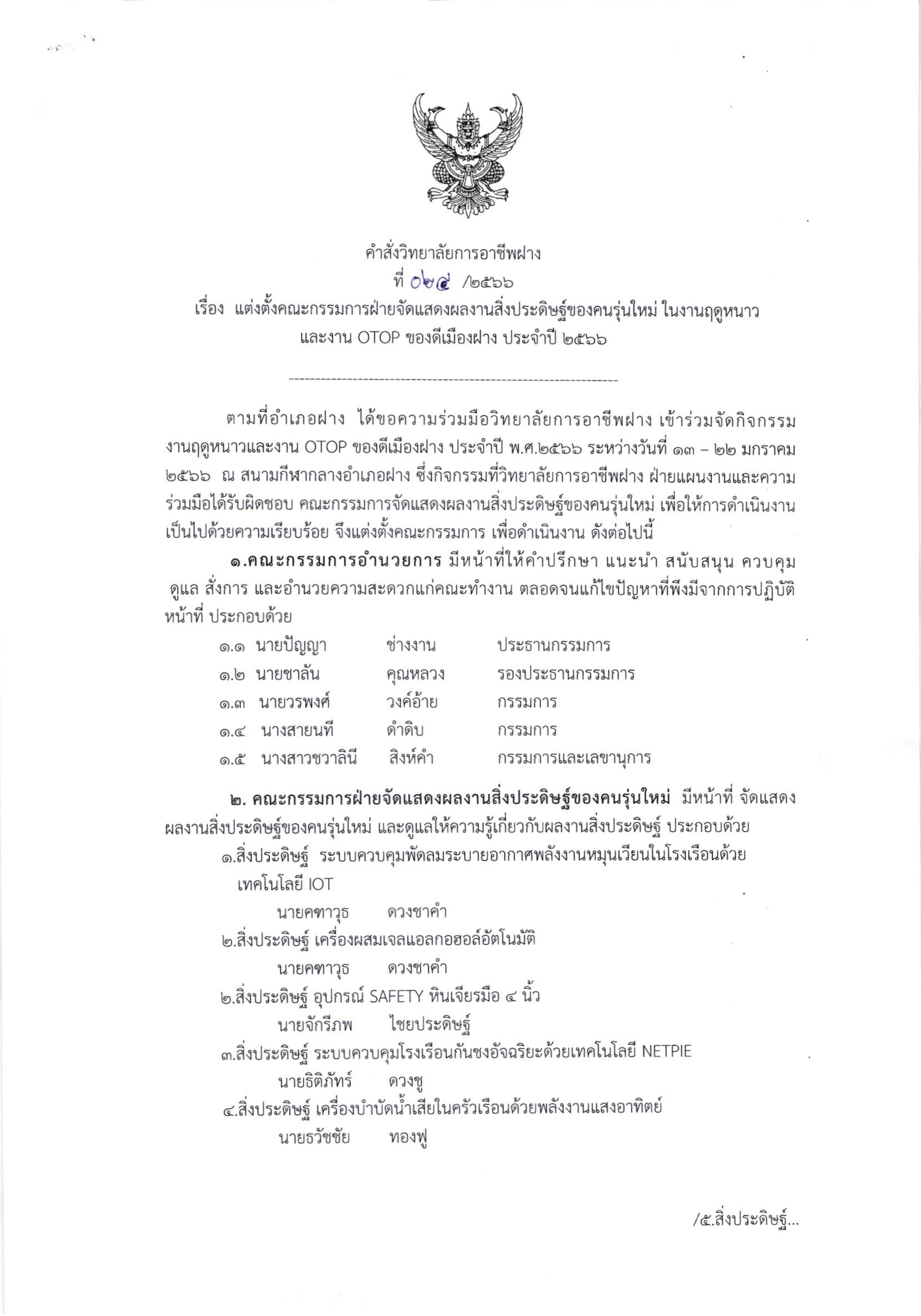 คำสั่ง แต่งตั้งคณะกรรมการฝ่ายจัดแสดงผลงานสิ่งประดิษฐ์ของคนรุ่นใหม่ ในงานฤดูหนาว และงาน OTOP ของดีเมืองฝาง ประจำปี 2566 10 มกราคม 202310 มกราคม 2023จุฑามาศ ณิชฐากรข่าวสารสำหรับครูและบุคลากร
