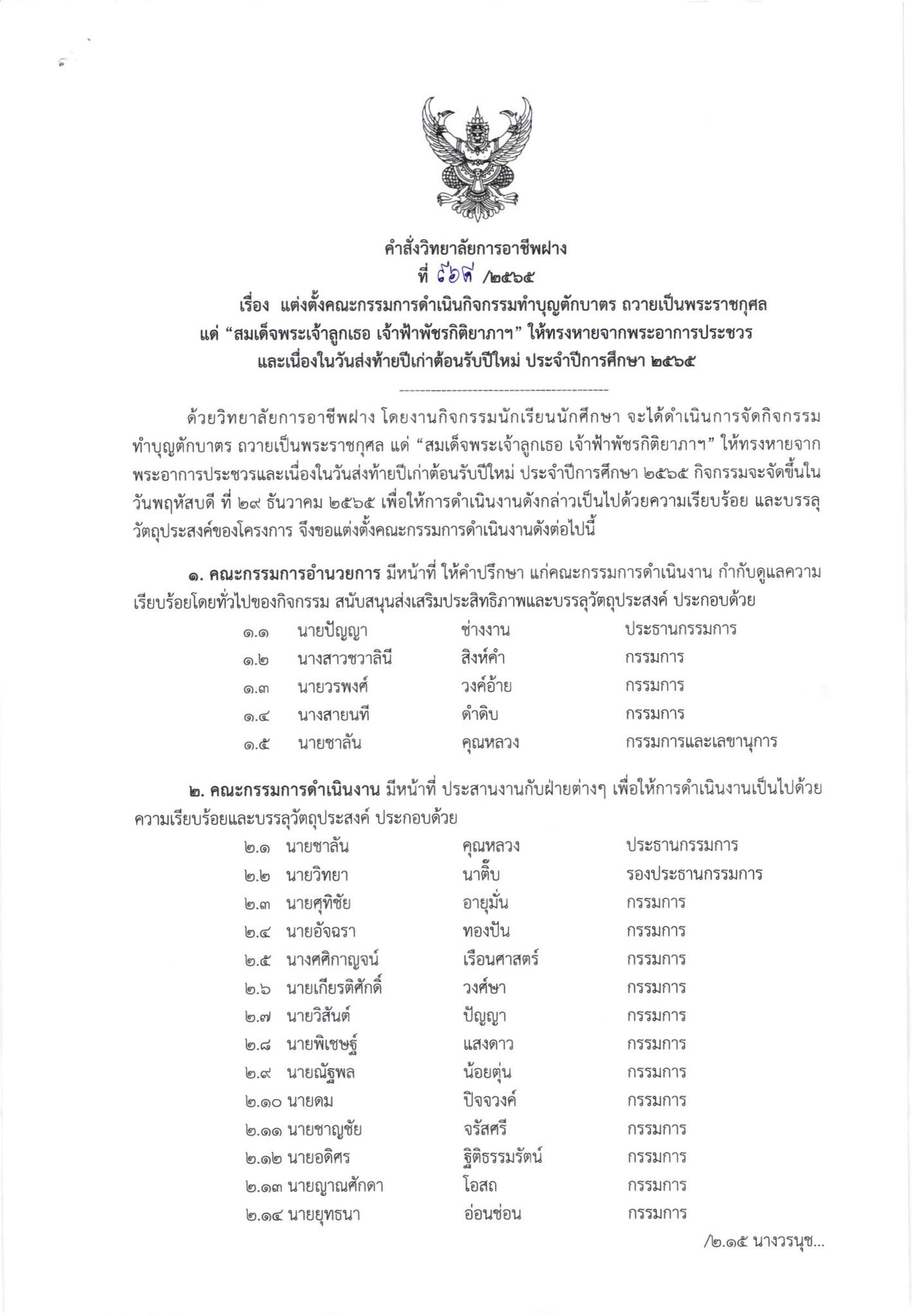คำสั่ง แต่งตั้งคณะกรรมการดำเนินกิจกรรมทำบุญตักบาตร ถวายเป็นพระราชกุศล แด่ “สมเด็จพระเจ้าลูกเธอ เจ้าฟ้าพัชรกิติยาภาฯ” ให้ทรงหายจากพระอาการประชวร และเนื่องในวันส่งท้ายปีเก่าต้อนรับปีใหม่ ประจำปีการศึกษา 2565 21 ธันวาคม 202221 ธันวาคม 2022จุฑามาศ ณิชฐากรข่าวสารสำหรับครูและบุคลากร