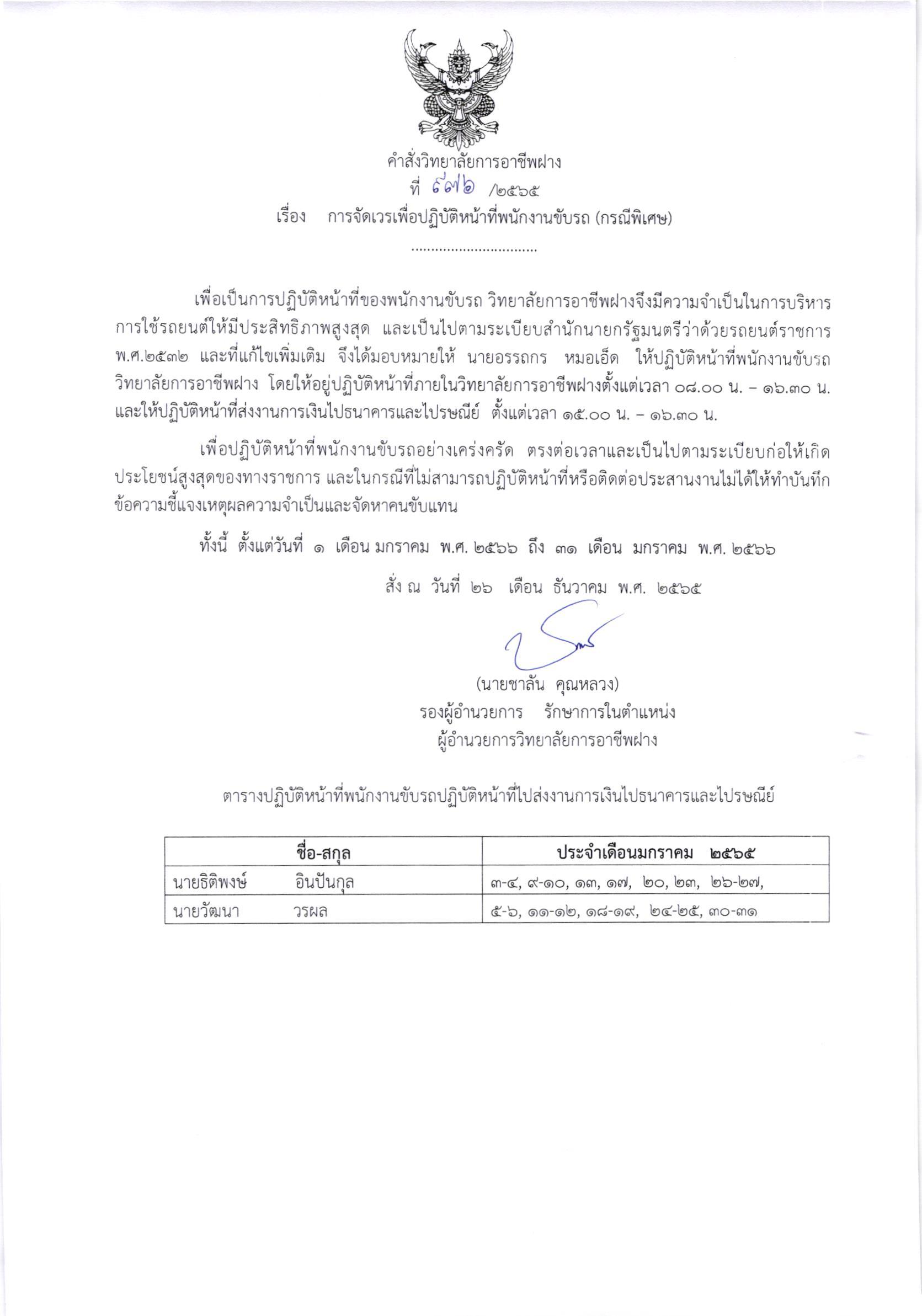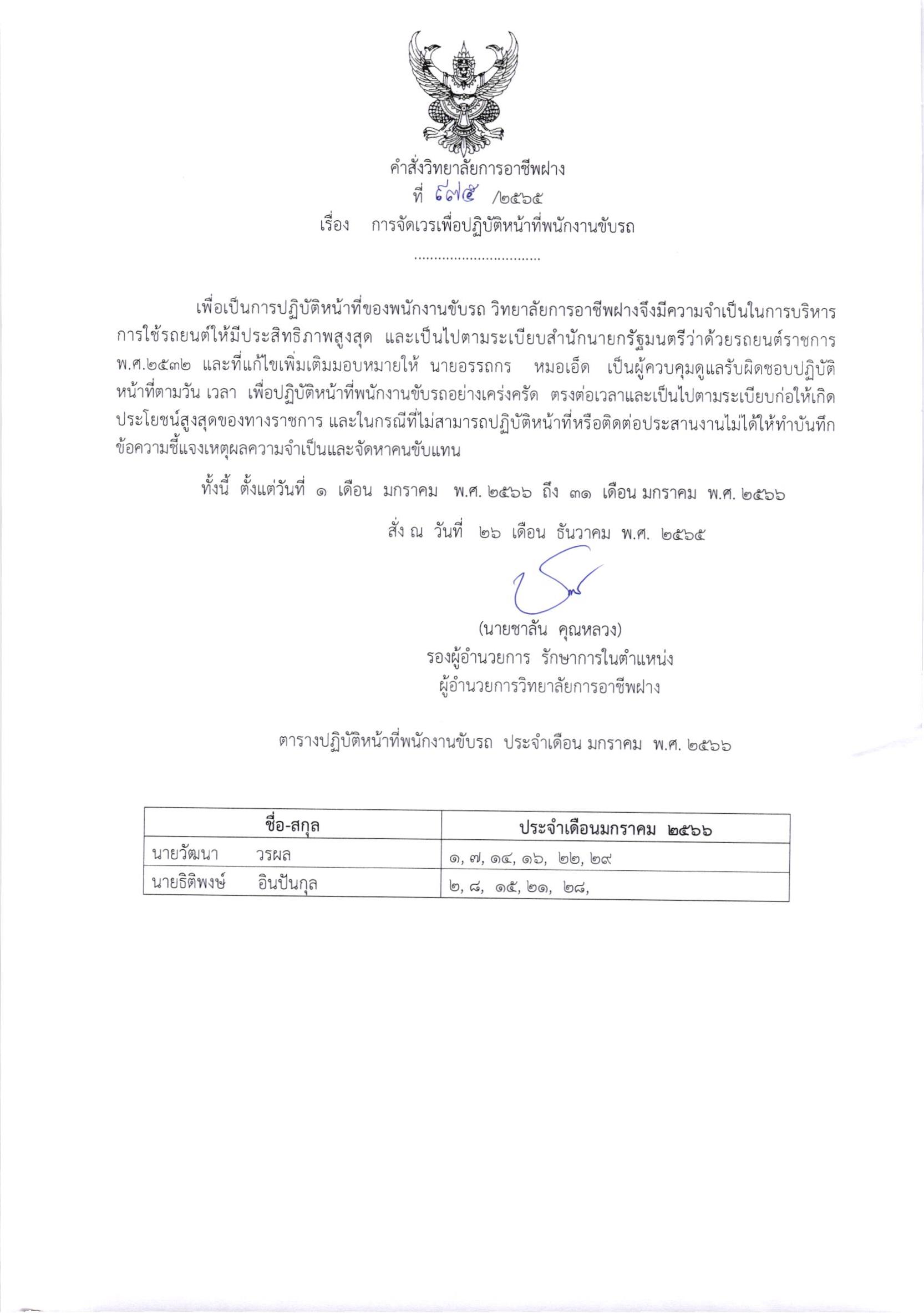 คำสั่ง การจัดเวรเพื่อปฏิบัติหน้าที่พนักงานขับรถ ประจำเดือน มกราคม 2566 26 ธันวาคม 202226 ธันวาคม 2022จุฑามาศ ณิชฐากรข่าวสารสำหรับครูและบุคลากร