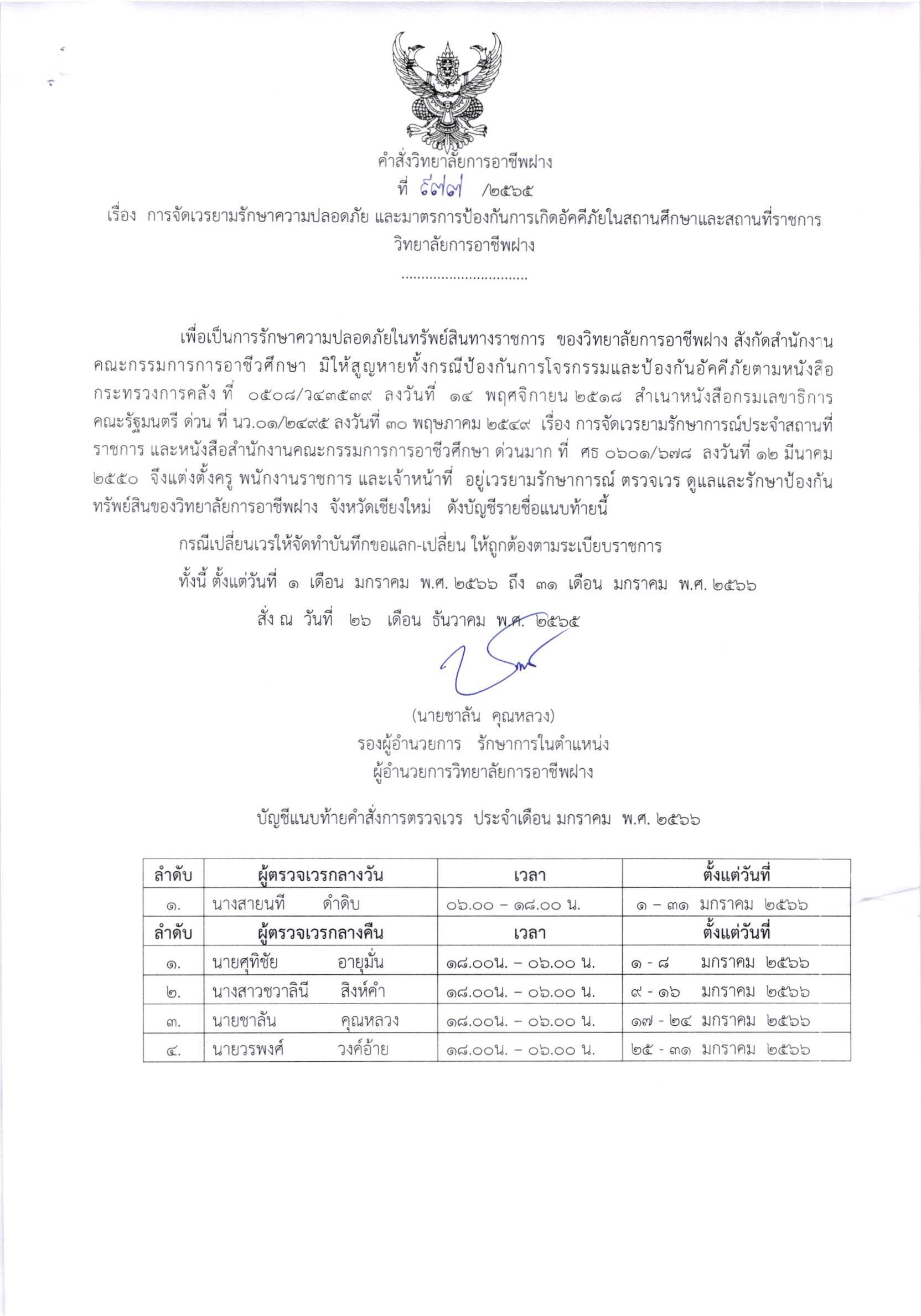 คำสั่ง การจัดเวรยามรักษาความปลอดภัย และมาตรการป้องกันการเกิดอัคคีภัยในสถานศึกษาและสถานที่ราชการ วิทยาลัยการอาชีพฝาง ประจำเดือน มกราคม 2566 26 ธันวาคม 202226 ธันวาคม 2022จุฑามาศ ณิชฐากรข่าวสารสำหรับครูและบุคลากร