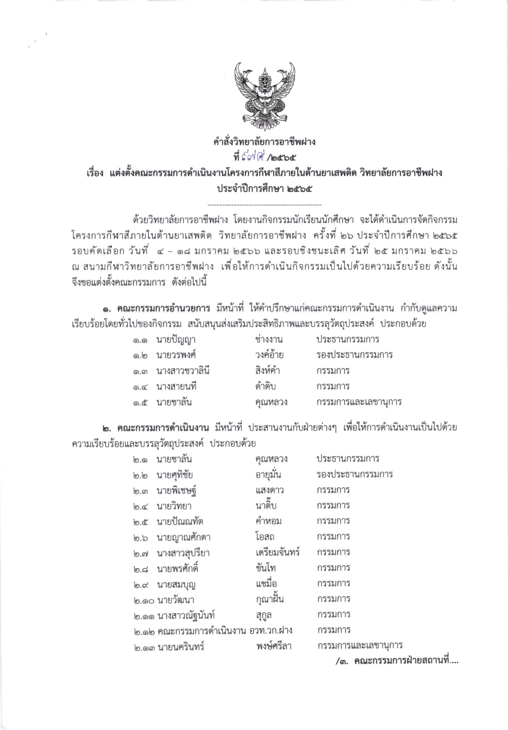 คำสั่ง แต่งตั้งคณะกรรมการดำเนินงานโครงการกีฬาสีภายในต้านยาเสพติด วิทยาลัยการอาชีพฝาง ประจำปีการศึกษา 2565 26 ธันวาคม 202226 ธันวาคม 2022จุฑามาศ ณิชฐากรข่าวสารสำหรับครูและบุคลากร