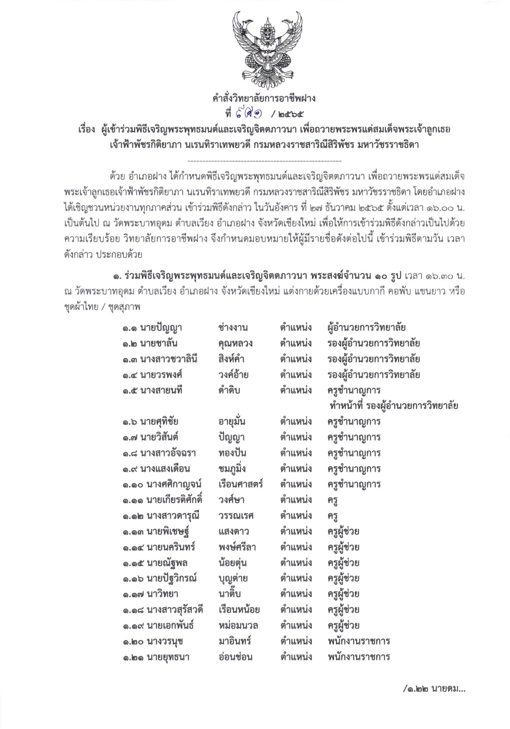 คำสั่ง ผู้เข้าร่วมพิธีเจริญพระพุทธมนต์และเจริญจิตตภาวนา เพื่อถวายพระพรแด่สมเด็จพระเจ้าลูกเธอเจ้าฟ้าพัชรกิติยาภา นเรนทิราเทพยวดี กรมหลวงราชสาริณีสิริพัชร มหาวัชรราชธิดา วันที่ อังคาร ที่ 27 ธันวาคม 2565 ณ วัดพระบาทอุดม อ.ฝาง ตั้งแต่เวลา 16.00น.เป็นต้นไป 27 ธันวาคม 202227 ธันวาคม 2022จุฑามาศ ณิชฐากรข่าวสารสำหรับครูและบุคลากร