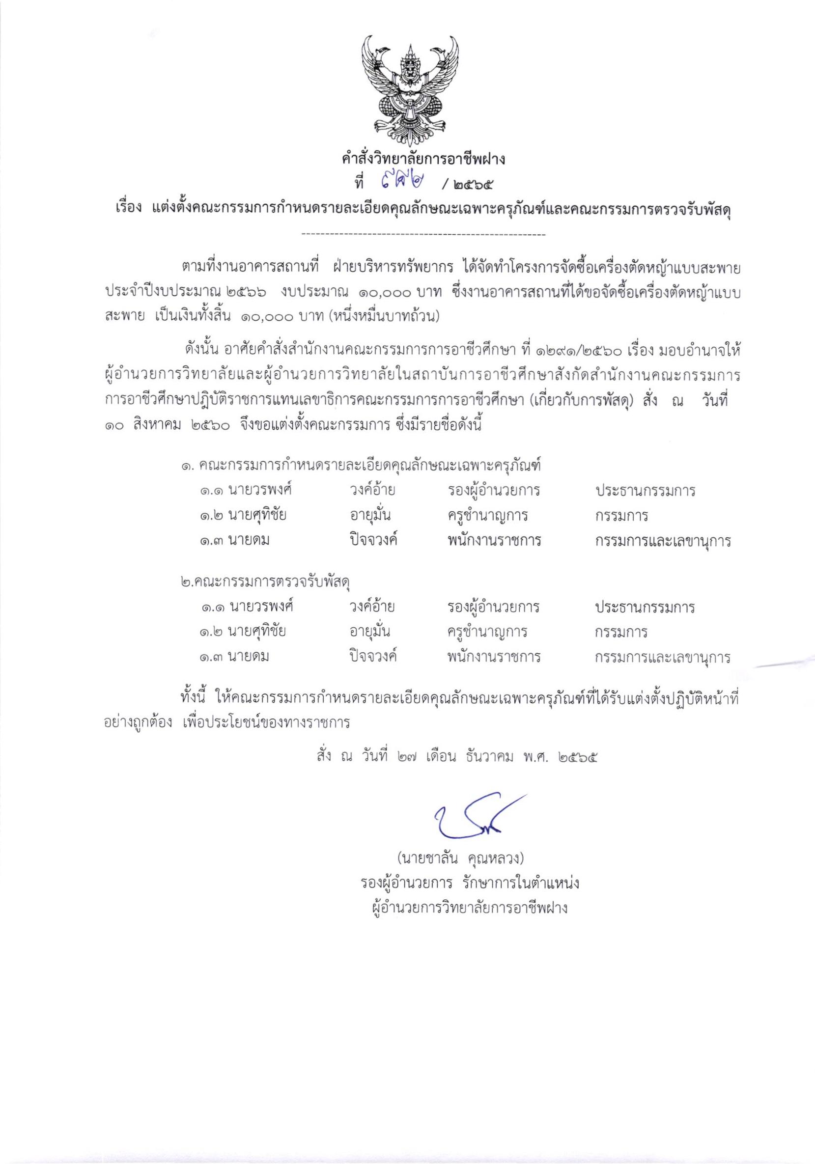 คำสั่ง แต่งตั้งคณะกรรมการกำหนดรายละเอียดคุณลักษณะเฉพาะครุภัณฑ์และคณะกรรมการตรวจรับพัสดุ ( งานประชาสัมพันธ์ ) 27 ธันวาคม 202227 ธันวาคม 2022จุฑามาศ ณิชฐากรข่าวสารสำหรับครูและบุคลากร