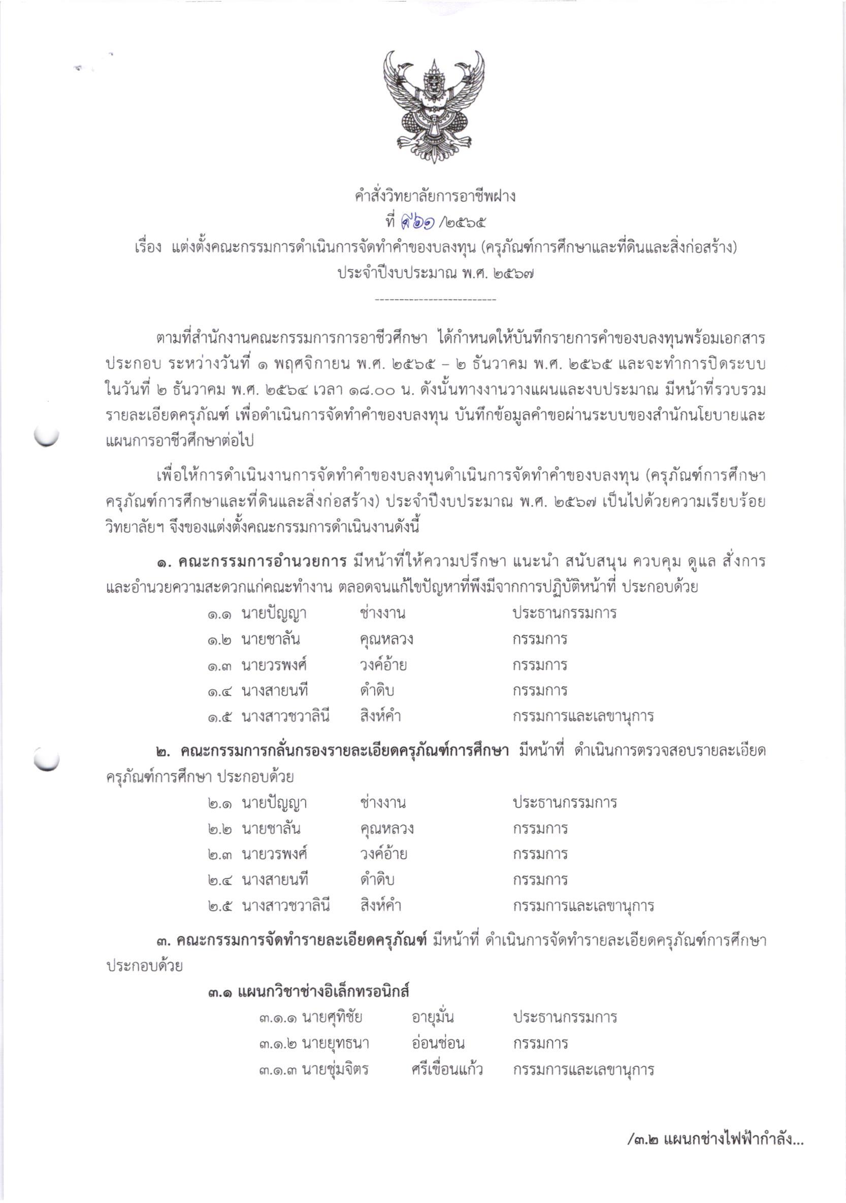 *** แก้ไข ***คำสั่งแต่งตั้งคณะกรรมการดำเนินการจัดคำของบลงทุน (ครุภัณฑ์การศึกษาและที่ดินและสิ่งก่อสร้าง) ประจำปีงบประมาณ พ.ศ. 2567 29 พฤศจิกายน 202229 พฤศจิกายน 2022จุฑามาศ ณิชฐากรข่าวสารสำหรับครูและบุคลากร