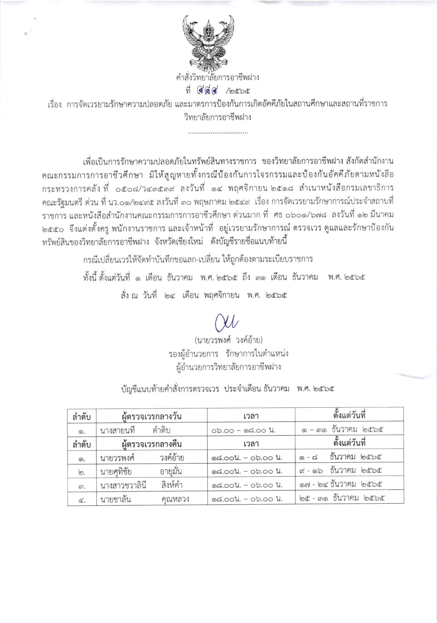 คำสั่ง การจัดเวรยามรักษาความปลอดภัย และมาตรการป้องกันการเกิดอัคคีภัยในสถานศึกษาและสถานที่ราชการ วก.ฝาง ประจำเดือน ธันวาคม 2565 24 พฤศจิกายน 202224 พฤศจิกายน 2022จุฑามาศ ณิชฐากรข่าวสารสำหรับครูและบุคลากร