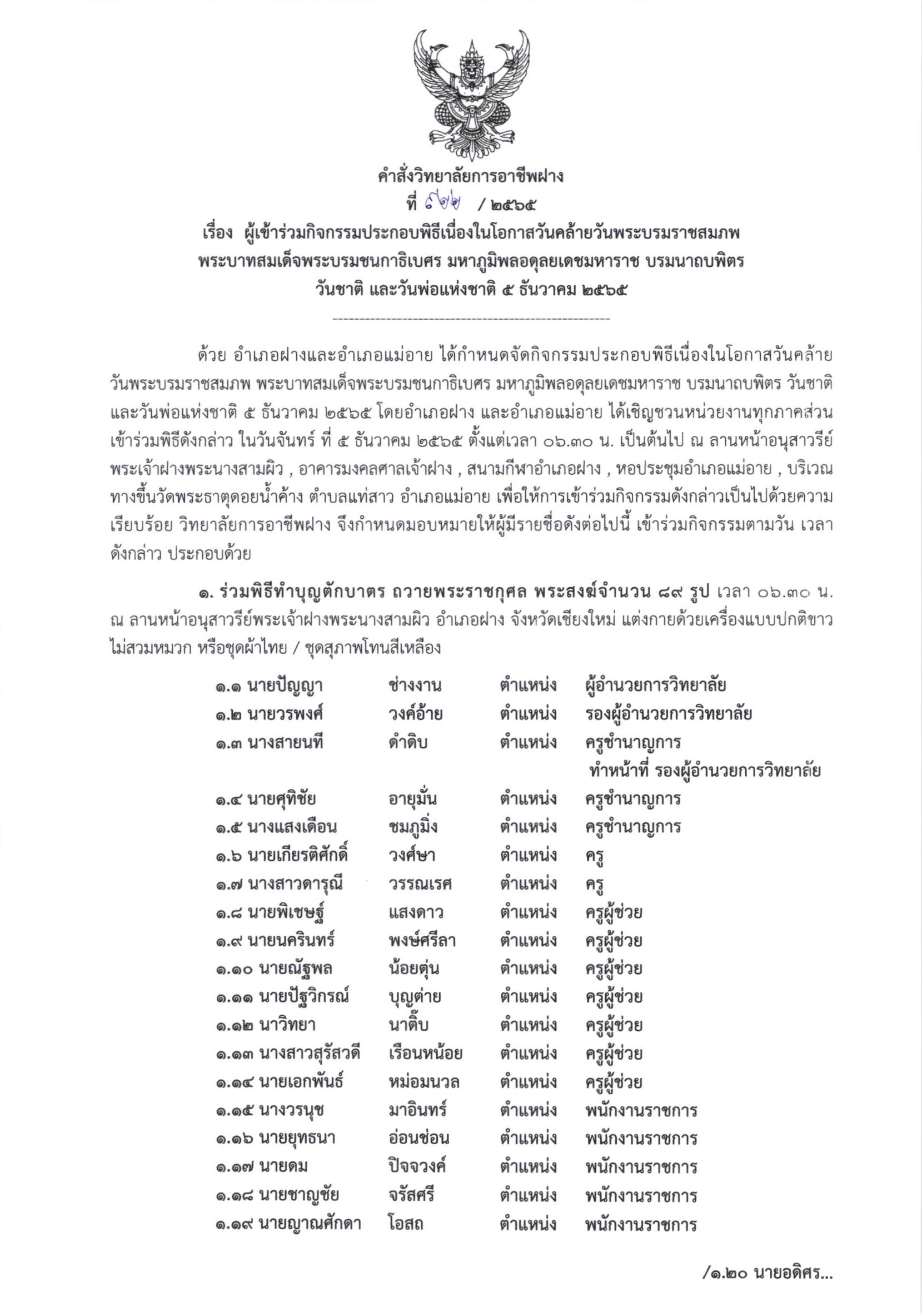 *** แก้ไข คำสั่ง *** คำสั่ง ผู้เข้าร่วมกิจกรรมประกอบพิธีเนื่องในโอกาสวันคล้ายวันพระบรมราชสมภพ พระบาทสมเด็จพระบรมชนกาธิเบศร มหาภูมิพลอดุลยเดชมหาราช บรมนาถบพิตร วันชาติ และวันพ่อแห่งชาติ 5 ธันวาคม 2565 2 ธันวาคม 20222 ธันวาคม 2022จุฑามาศ ณิชฐากรข่าวสารสำหรับครูและบุคลากร