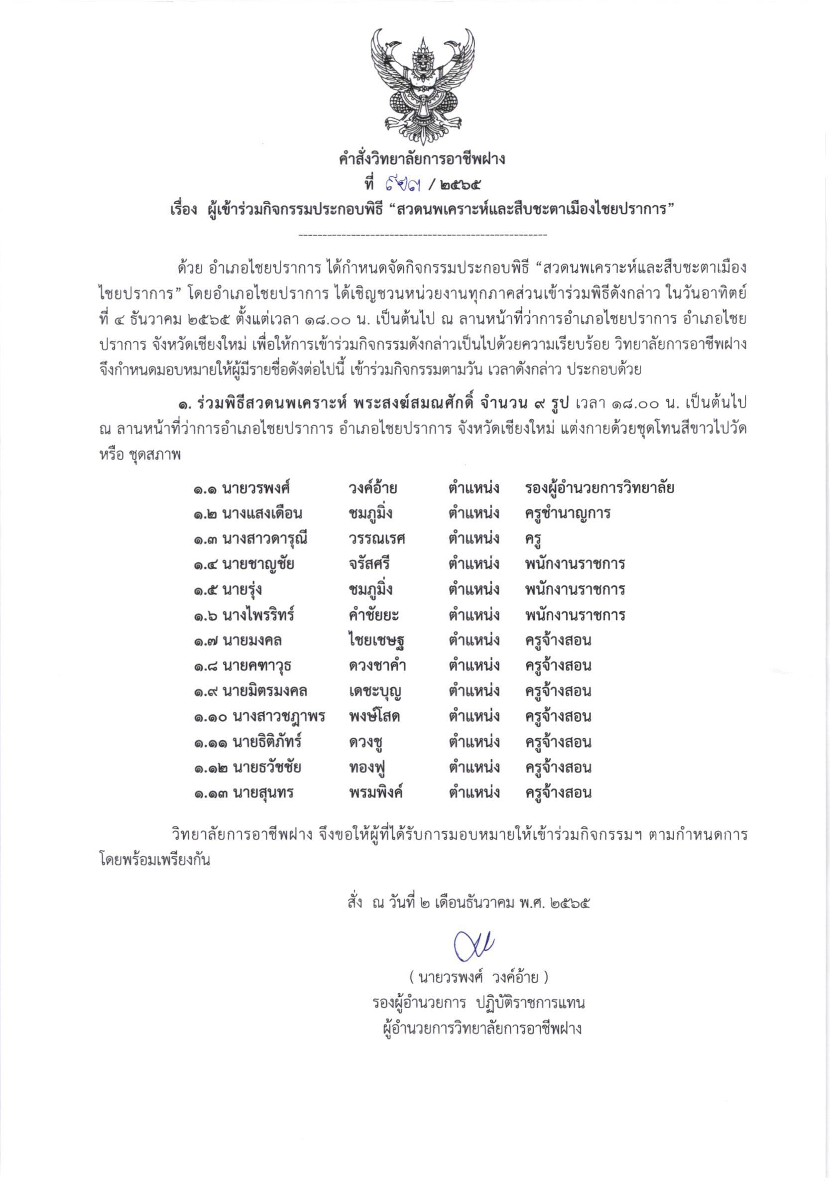 *** แก้ไข คำสั่ง *** คำสั่ง ผู้เข้ากิจกรรมประกอบพิธี “สวดนพเคราะห์และสืบชะตาเมืองไชยปราการ” 2 ธันวาคม 20222 ธันวาคม 2022จุฑามาศ ณิชฐากรข่าวสารสำหรับครูและบุคลากร