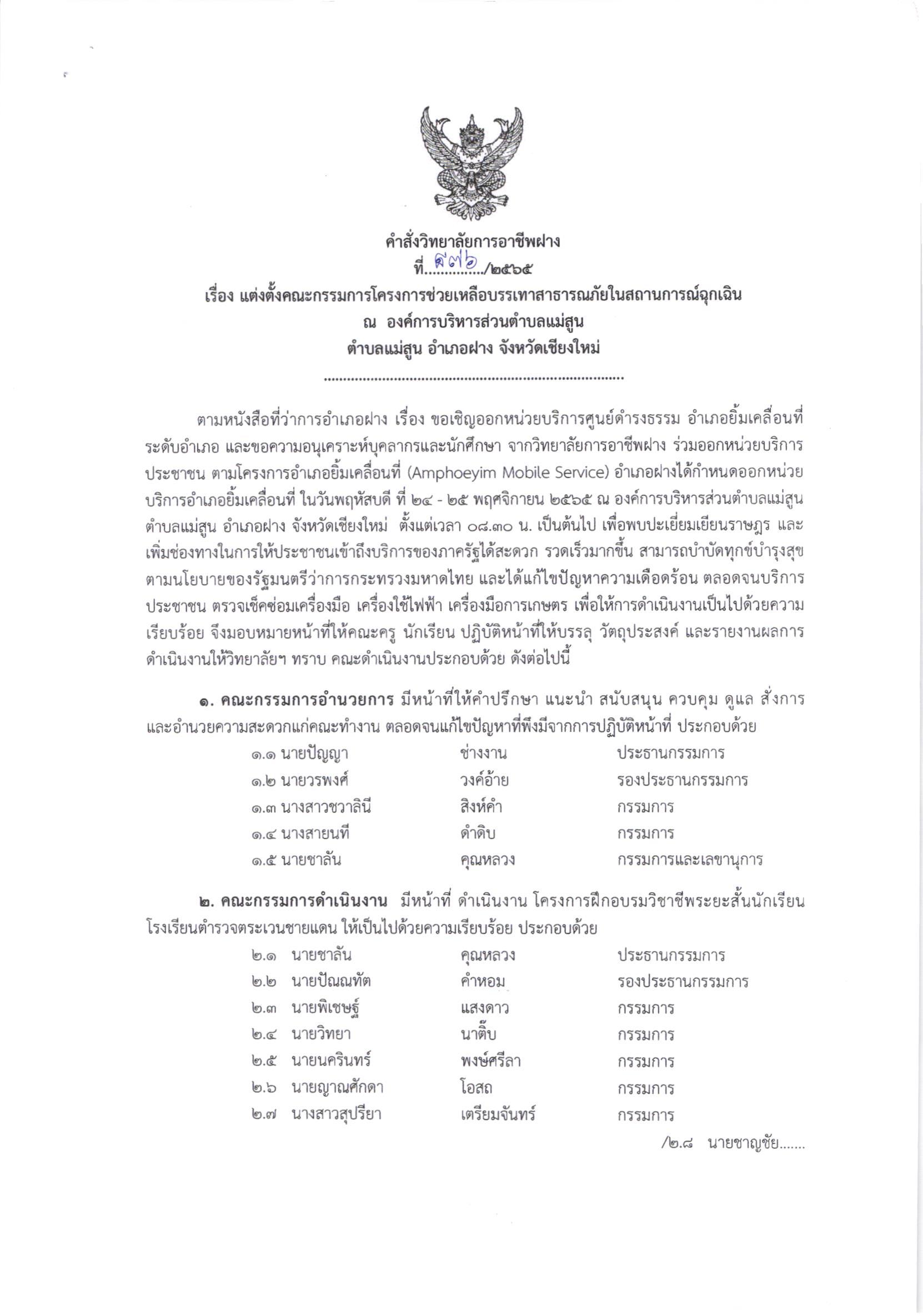 คำสั่ง แต่งตั้งคณะกรรมการโครงการช่วยเหลือบรรเทาสาธารณภัยในสถานการณ์ฉุกเฉิน ณ องค์การบริหารส่วนตำบลแม่สูน อ.ฝาง จ.เชียงใหม่ 21 พฤศจิกายน 202221 พฤศจิกายน 2022จุฑามาศ ณิชฐากรข่าวสารสำหรับครูและบุคลากร