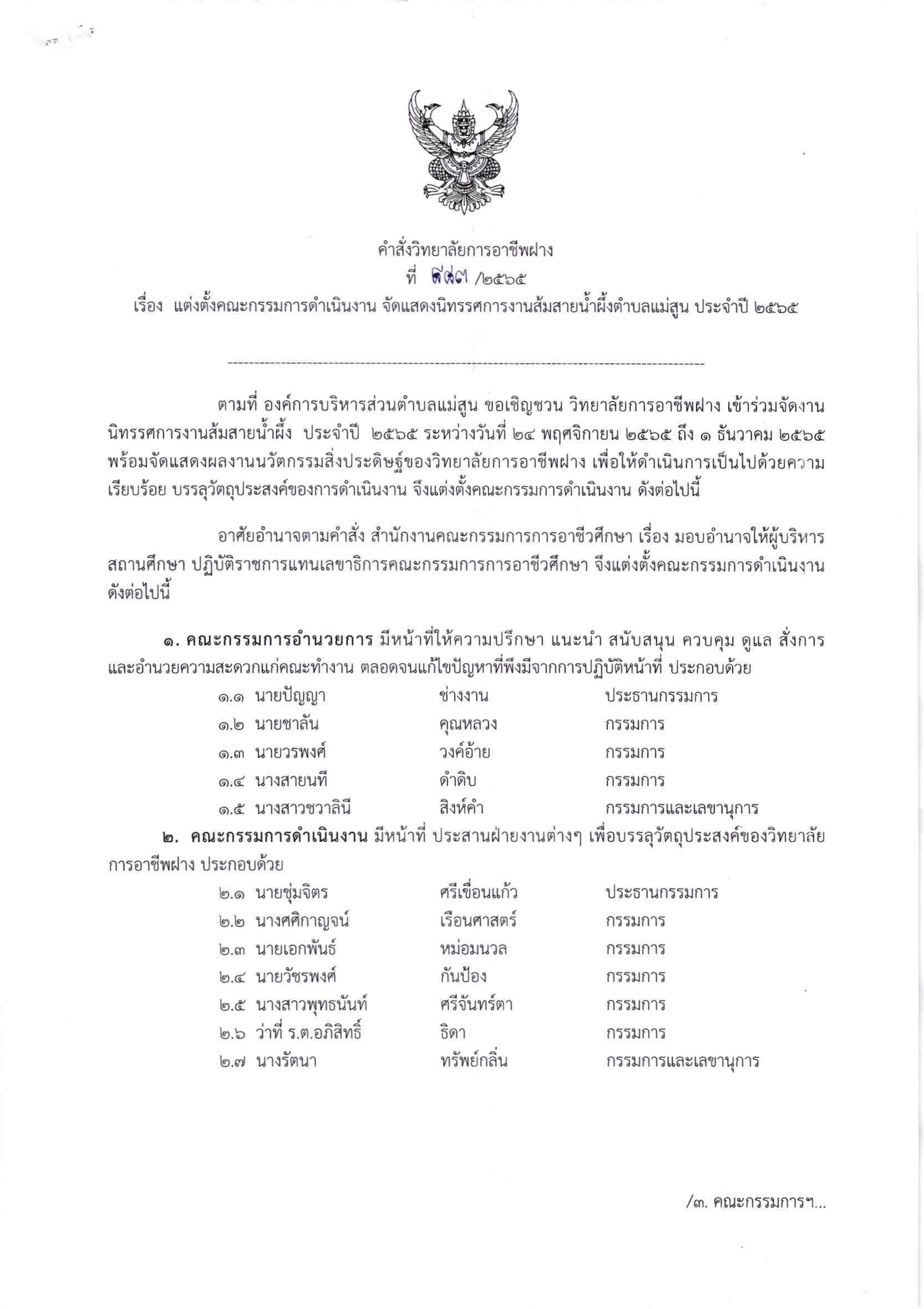 คำสั่ง แต่งตั้งคณะกรรมการดำเนินงาน จัดแสดงนิทรรศการงานส้มสายน้ำผึ้งตำบลแม่สูน ประจำปี 2565 23 พฤศจิกายน 202223 พฤศจิกายน 2022จุฑามาศ ณิชฐากรข่าวสารสำหรับครูและบุคลากร