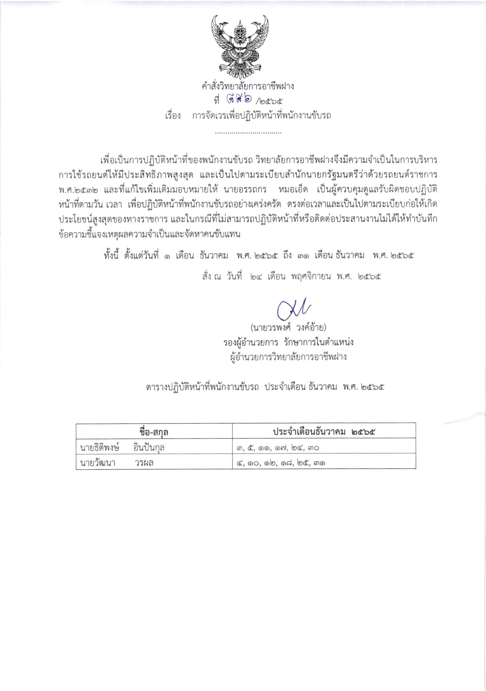 คำสั่ง การจัดเวรเพื่อปฏิบัติหน้าที่พนักงานขับรถ ประจำเดือน ธันวาคม 2565 24 พฤศจิกายน 202224 พฤศจิกายน 2022จุฑามาศ ณิชฐากรข่าวสารสำหรับครูและบุคลากร