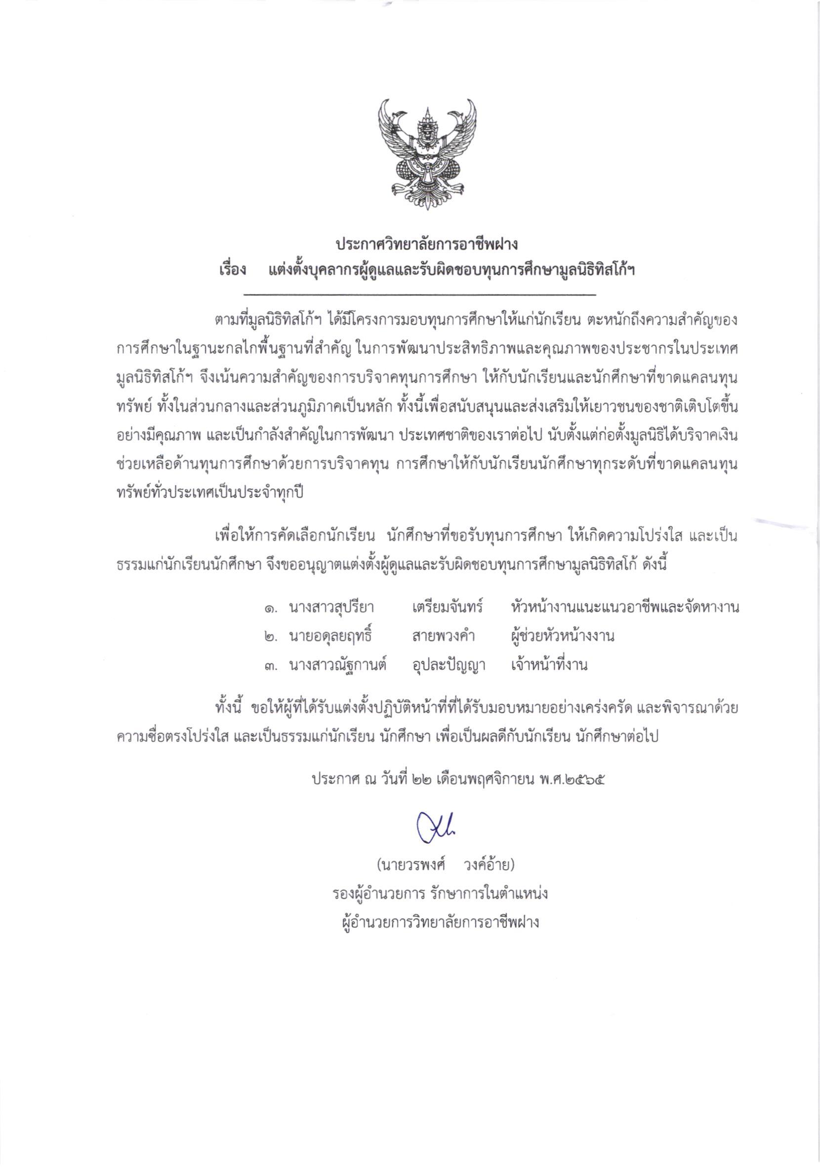 ประกาศ วิทยาลัยการอาชีพฝางเรื่อง แต่งตั้งบุคลากรผู้ดูแลและรับผิดชอบทุนการศึกษามูลนิธิทิสโก้ฯ 23 พฤศจิกายน 202223 พฤศจิกายน 2022จุฑามาศ ณิชฐากรข่าวสารสำหรับครูและบุคลากร
