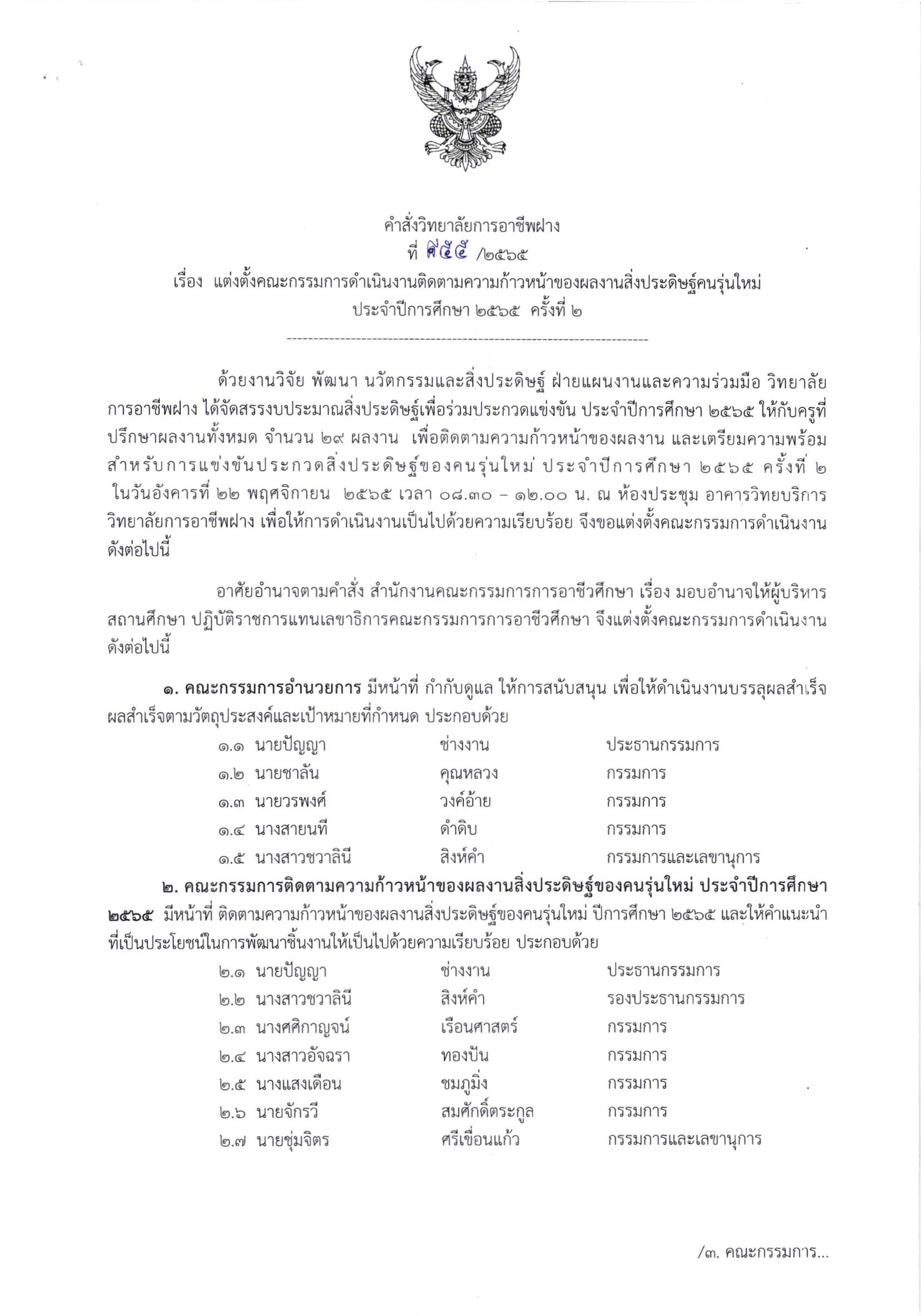คำสั่ง แต่งตั้งคณะกรรมการดำเนินงานติดตามความก้าวหน้าของผลงานสิ่งประดิษฐ์คนรุ่นใหม่ ประจำปีการศึกษา 2565 ครั้งที่ 2 14 พฤศจิกายน 202214 พฤศจิกายน 2022จุฑามาศ ณิชฐากรข่าวสารสำหรับครูและบุคลากร